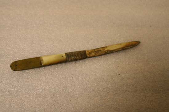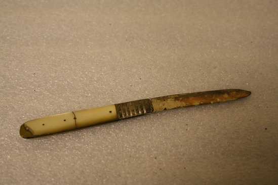 Said to have belonged to Charles William and Julius Deming but the intials D.D. may indicate Dorothy Deming. The knife (b) came from Lucretia Deming's strong box
