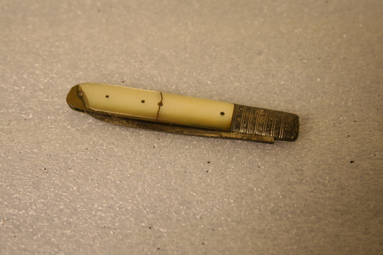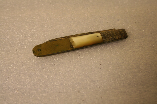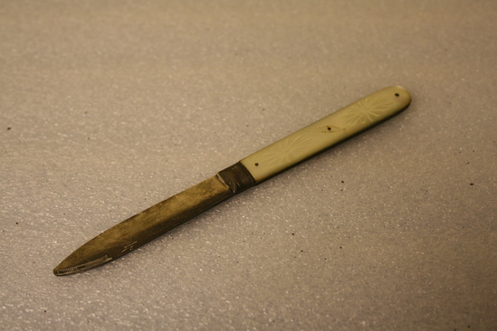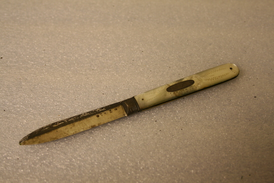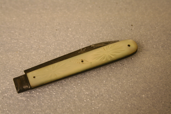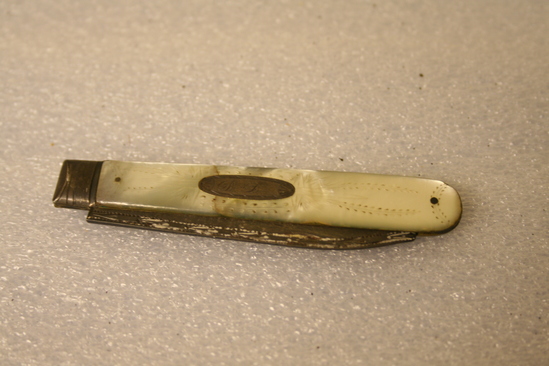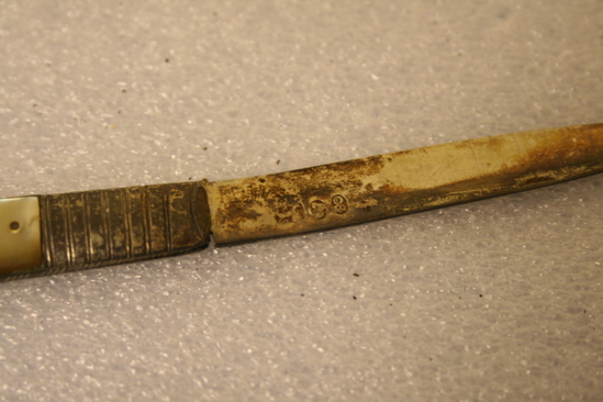 A: Mother of pearl handle on brass with steel blade. Steel at top of handle before blade. Stampled on blade "O" with a crown, man's head and lion. B: Highly ornate mother of pearl handle with steel plate for initials. Steel blade with top portion also decorated. Initials "DD" on knife. Possibly for Dorthy Deming