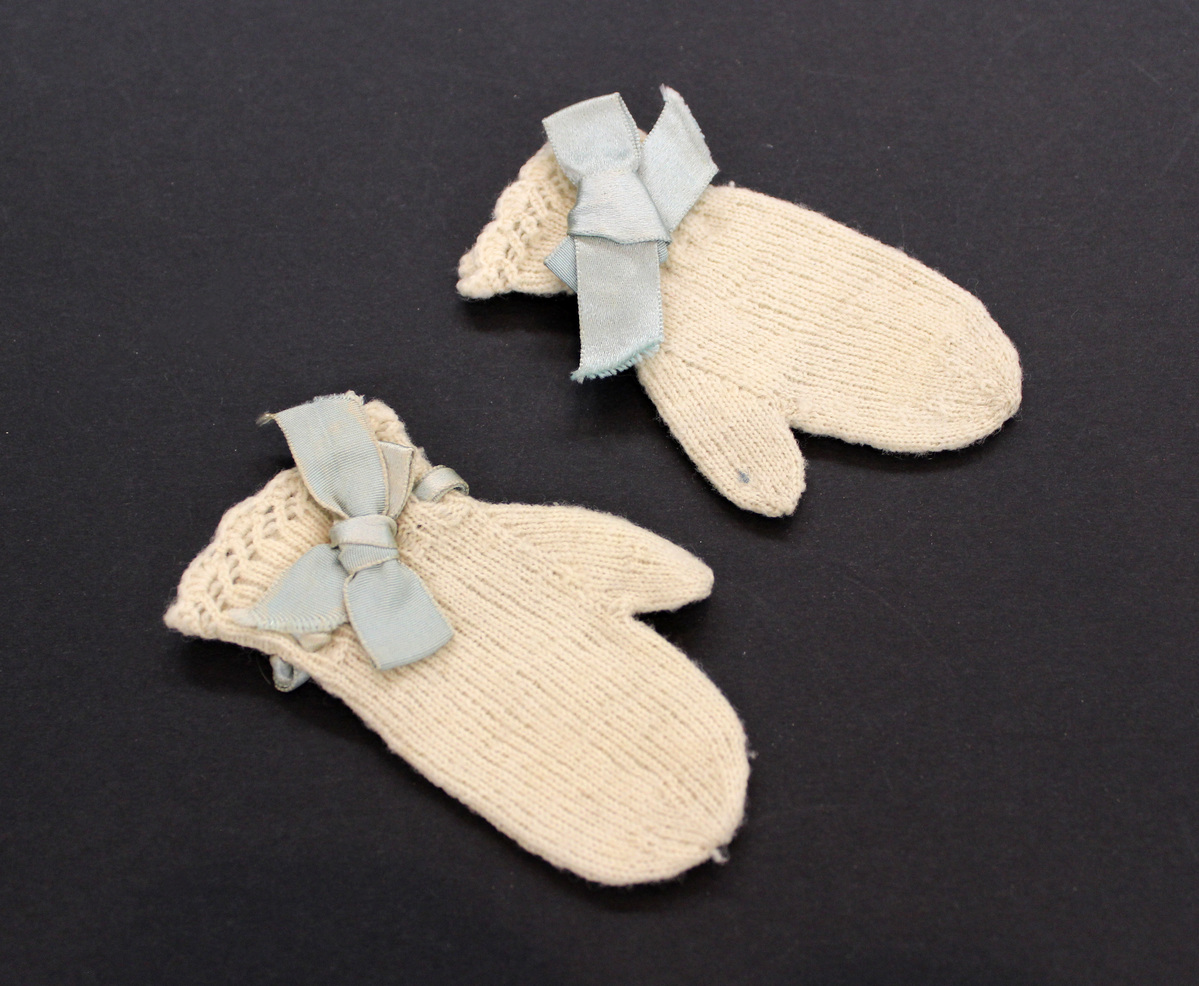 Pair of off-white wool knit child's mittens; open stitch knit at wrist; blue silk ribbon beaded through holes and tied