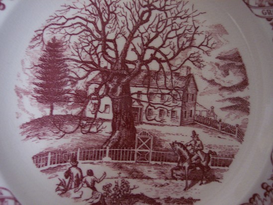 PINK TRANSFER DESIGN ON RIM; GRAPE VINE ENTWINED WITH RIBBON WITH NAMES OF CONNECTICUT TOWNS. MATCHES TWO OTHER PLATES. THIS PLATE DEPICTS THE CHARTER OAK AND THE WYLLYS MANSION AT HARTFORD.