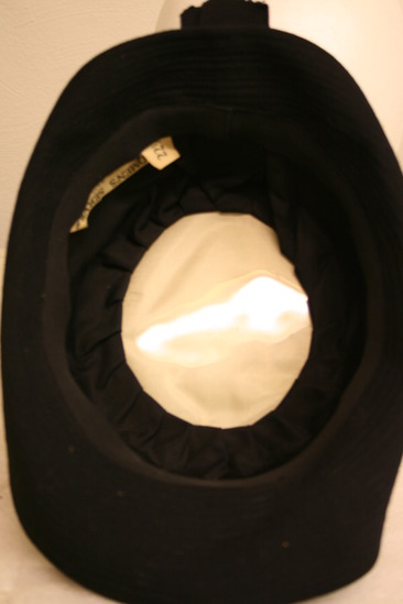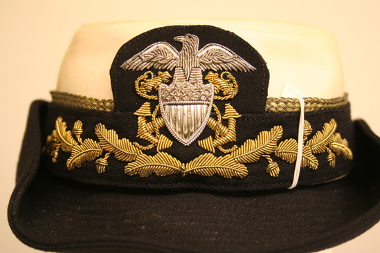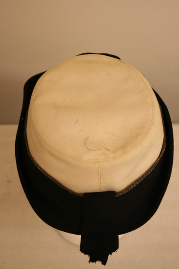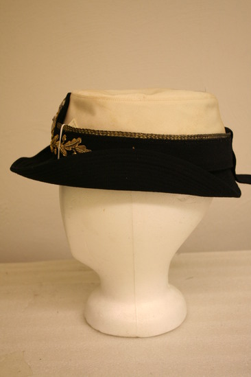 Oval cap with inward sloping sides, flat top and brim folded up on sides but not in front or back; crown made of white material and brim dark blue; around base of crown is a 1 1/2" band made of dark blue cotton with a gold ribbon along top side; in front, gold leaves are embroidered on the band and a tall piece has an eagle with a sheild embroidered in silver; interior lined with black silk, except for the center which is white and plastic