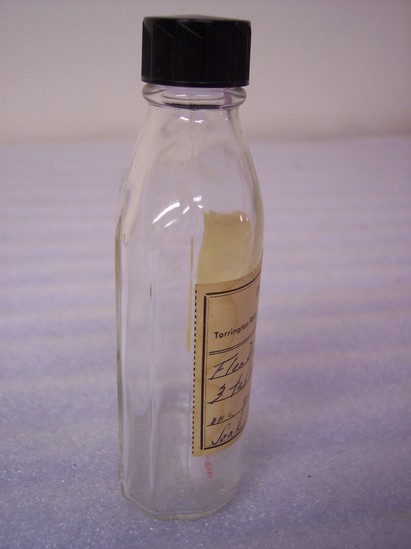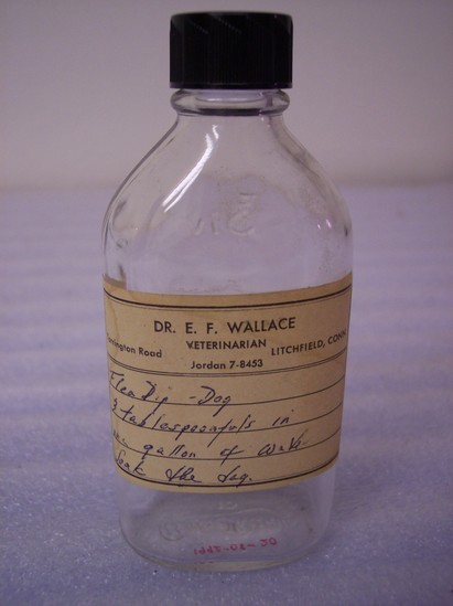 Clear glass with paper label attached. From veternarian E.F. Wallace's Litchfield office. Once held flea dip; instructions for use on label.