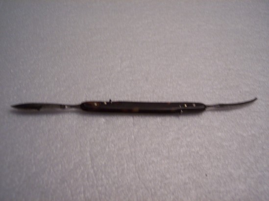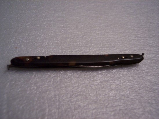 Two metal blades with tortoise shell case into which they can be folded. Each blade stamped "Tiemann"