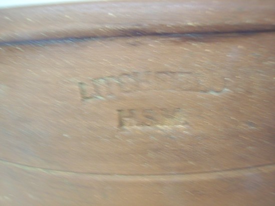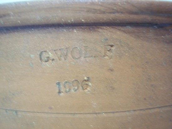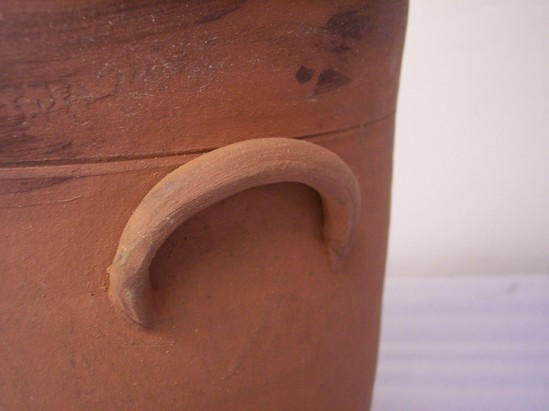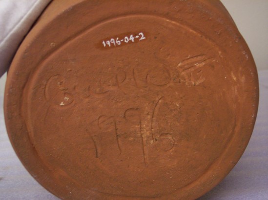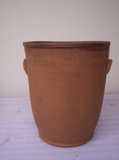 Redware crock or jar, very tall, formed on a wheel, slip interior, rolled rim, footed base, integral handles, stamped on one side outside near rim: "G.WOLFF/1996, on opposite side: LITCHFIELD/H.S.M" Reproduction of a Hervey Brooks design (19th C Goshen potter) from the Collection (1956-04-1). On bottom, line incised: "G Wolff/ 1996". Rolled in grass and dirt to antique. Made for exhibition for LHS.