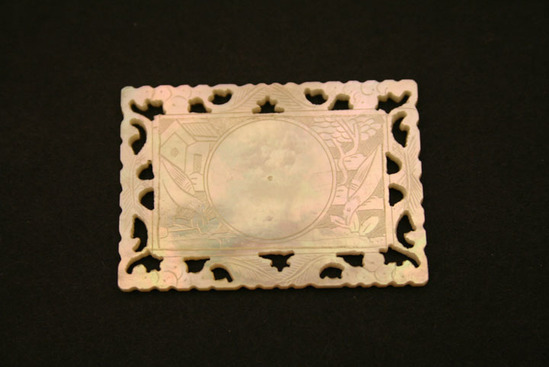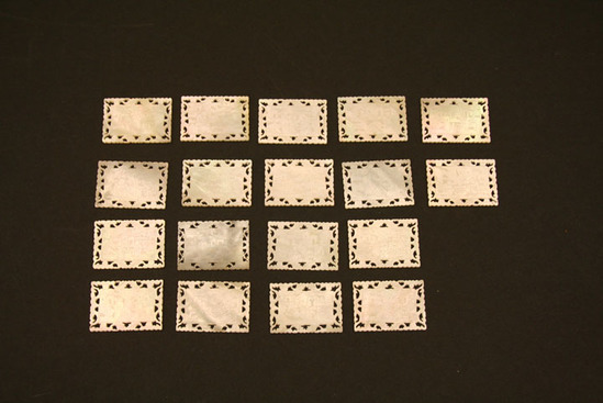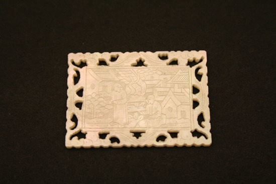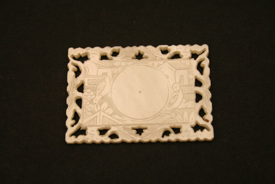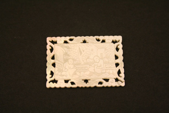 18 game counters. Rectangular shaped - pierced border - on one side incised design of Asian scene of two men with houses in background, design varies slightly from counter to counter - men sometimes sitting and sometimes standing - also variations in background. Reverse side has plain circle in center with two birds and two homes around it - again design varies from counter to counter
