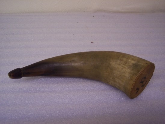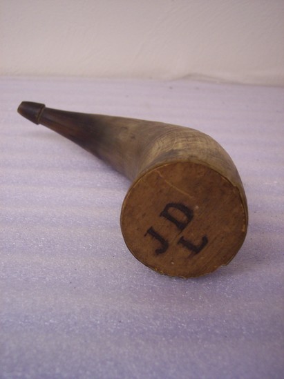 Wood plug nailed into large end. Small end cut into flare to keep string or thong around the horn from sliding off. Initials "JDL" inked on it, horn slightly chipped at this end.