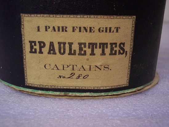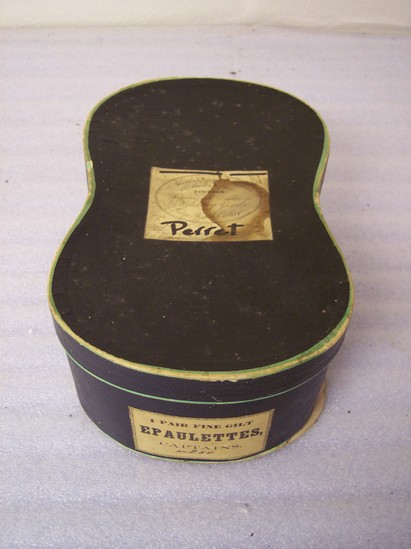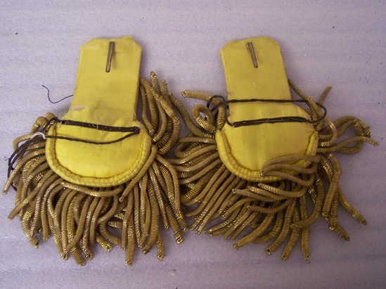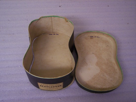 B: formal gold dress epaulets with gold wire braid and metal and gold cloth and braid top, one has silver bar partially pinned on, some were removed later or added later, yellow silk lining with brown lacing tacked to underside. Metal rod at shoulder end to go on shoulder tab C - Cardboard box, figure 8 shape, with lid. Label on side of box