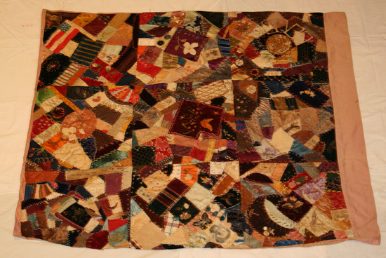 Patchwork friendship style crazy quilt, made of 9 16"x16" sqaures of variuos materials, with various floral and butterfly motif embrioderies some appliqued and/or painted, unusual patches include one that is woven with frog climbing a ladder bearing the inscription "Fine Morning Sir." Sewn together with various stitch patterns, backed with pink cotton sateen. Quilt is an irregular shape, the shapes are not perfectly parallel to each other.