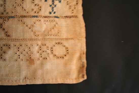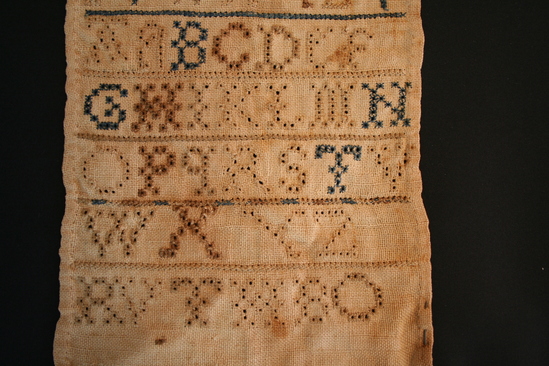 On a coarse brown material, brown, beige and blue thread were used to embroider the alphabet in capitol letters three times at the top is a design of "+" across and "Y" across. "IBIB" is embroidered across the top line. After the alphabet the letters "R V T H B O" are embroidered on the bottom.
