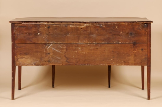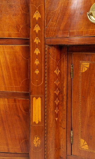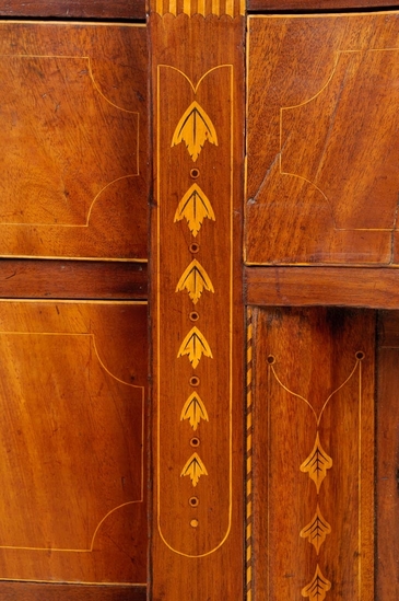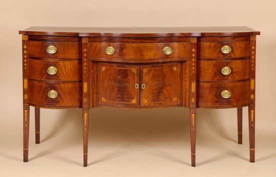 Sideboard, mahogany and mahogany veneer with tulip wood inlays, pine and cherry secondary woods. Serpentine front divided into three sections, each side section with three graduated drawers, either side of a central section with recessed locking two-door cabinet below one long drawer. All on six legs. Bellflower, reed, line, paterae and quatrefoil inlay patterns.