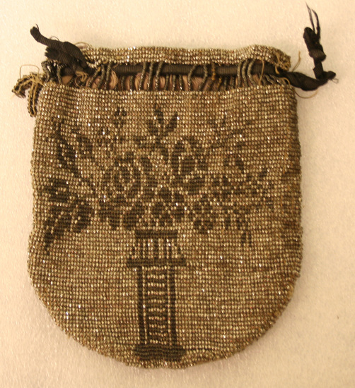 Small purse or wallet. Grey silk lining. Exterior covered in grey metallic beads with design of pedestal with bouquet of flowers in black beads on each side. Black silk ribbon woven through top.