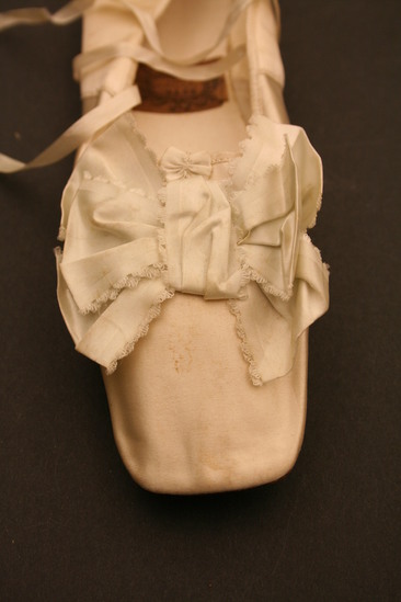 White satin shoes, slipper style with no heel; large blue silk bow on toe with fringe; long side ties; paper label on inside of shoe "53390 K/Este/R. de la Paix 13/Paris"