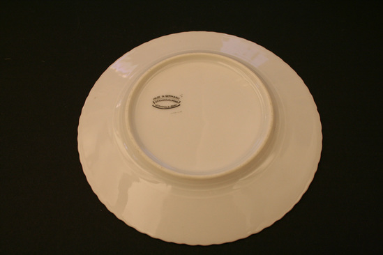 Round ceramic plate. Crimped edge with band of gold paint fading towards the center. Black and white lithograph of Mansion House and Court House on West St. Printed underneath "Mansion House, burned June 11, 1886" Repeating curved line design molded into ceramic around lithograph accented with thin gold line. Lable on underside of plate "Made in Germany/Grannis & Elmore/Litchfield, Conn"