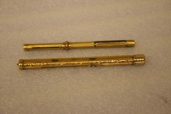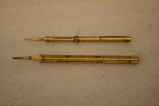 A: Retractable mechanical pen/pencil. Metal body painted gold. Round cylindrical shape. Sliding button on side of body then will extend either the pen nib or the pencil from the shaft. B: Rectractable mechanical pen/pencil. Metal body painted gold. Round cylindrical shape. Sliding button on side of body that will extend either the pen nib or the pencil from the shaft. The top of the body also unscrews over a lead storage compartment.