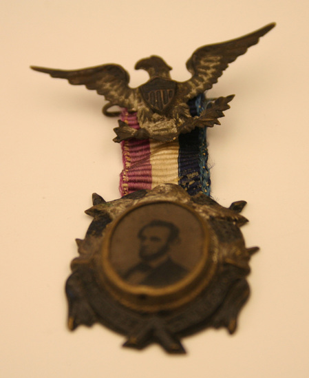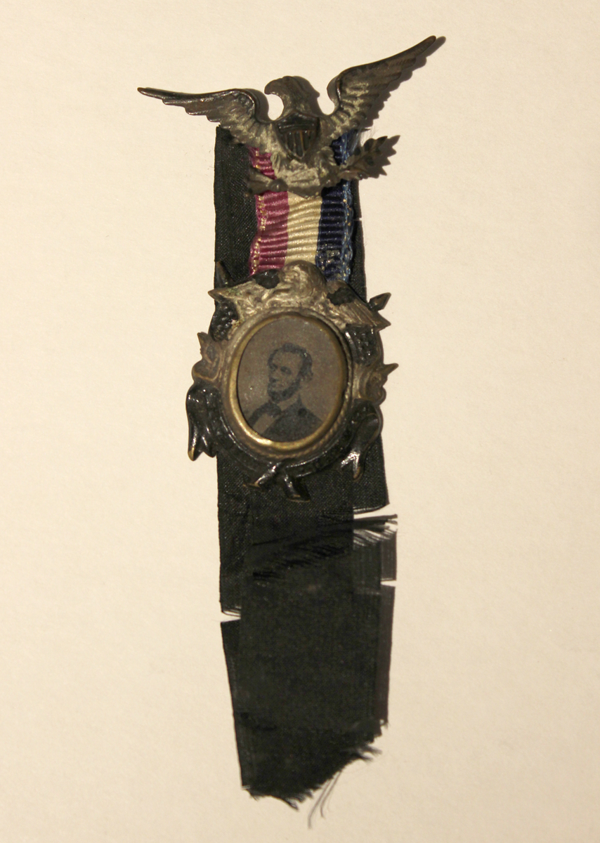 A: Badge with tintype of Abraham Lincoln in center. Attached to red, white and blue ribbon with eagle at top with shield on its chest. B: Piece of black silk ribbon