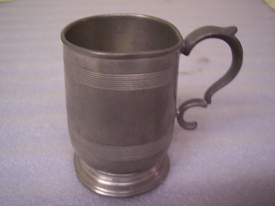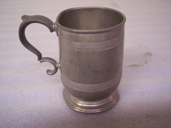 Sides slightly sloping. S-handle, lines around sides, rim on top. Slightly footed base.