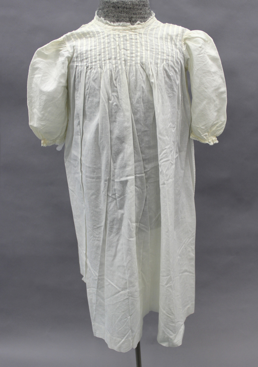 White cotton child's dress; long sleeves with cuff with lace trim; round neck with lace trim; tucks on front and back bodice; open back with three buttonholes, no buttons