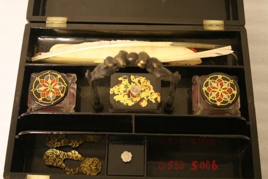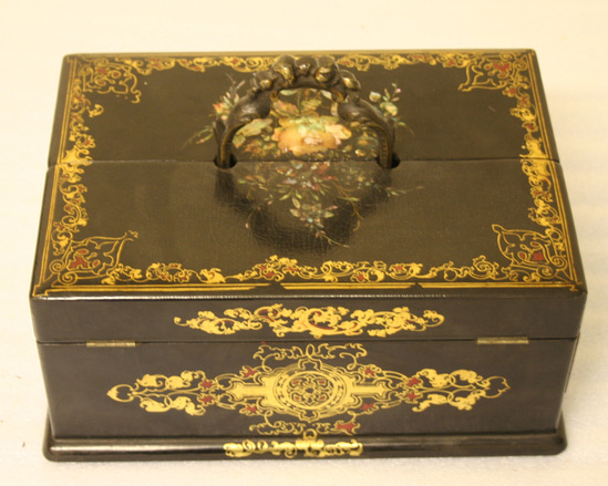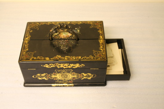 Wooden writing desk or box. Laquered black on all sides and interior. Decorative gilt painting in corners and on sides of box in scrolled designs. Bouquet of flowers done on top in papier mache with inlaid mother of pearl. Lid divided in center and hinged on both sides to fold up. Compartments on interior for writing instruments. Two glass bottles with decoratively painted lids. Caste brass handle with scrolled design in center of box. On one side of box a drawer pulls out.