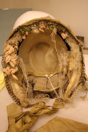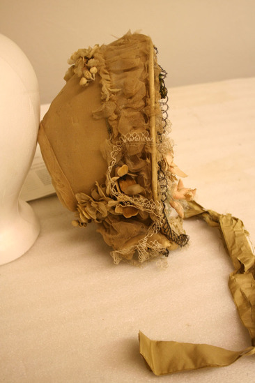 Brown crepe bonnet with 2" brim; inside brim decorated with white and black lace; pink flowers along left side and top; crepe shirred along brim with beige dime-sized leaves; green/brown ribbons to tie in bottom of front