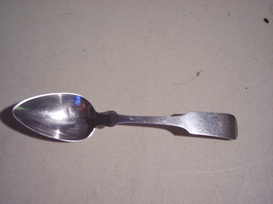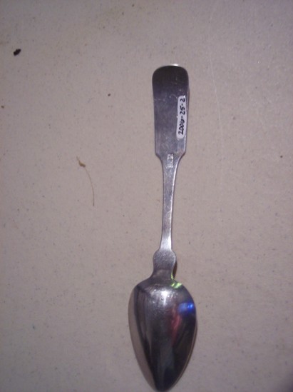 Silver teaspoon - oval bowl, pointed at end. Rectangular shaped end to handle of spoon. Monogrammed "AB" Hallmark on back "RM" in serrated rectangle.