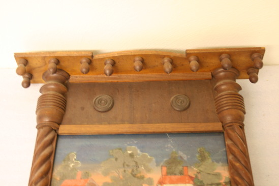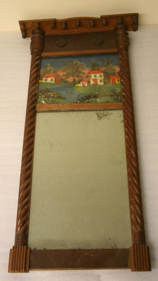 Wood framed mirror. The mirrored glass measures 16 3/4" high x 10" wide. Above the mirrored glass is an eglomise painting measuring 8 1/8" high x 10" wide. The frame is cherry with a mahogany veneer. Horizontal fluted base with rope twist columns on either side of mirrored glass. Urn shaped capital at top of rope twisted columns with horizontal turnings, fluted bar between mirrored glass and painted glass panel. Plain bar above painted glass with two turned buttons in panel above. Fluted top bar. Broken horizontal cap with 11 acorn pendants. The painted glass panel shows two houses seperated by a stream with fence in foreground. There is a crack in painted glass on right side.