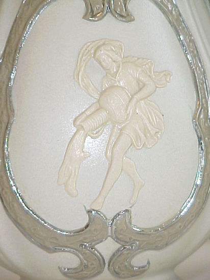 Earthenware vase created in a two-part mold with matte taupe exterior glaze. Interior is lead glazed. Vase has applied strapwork decoration in a darker taupe color outlined with a silver lustre. The lip of the vase is scalloped and pierced. The two molded handles are applied. One side has an applied figure pouring water from a pitcher in high relief. The other side features a man in Chinese costume carrying a basket of flowers on his back. His feet meet the strapwork decoration. There is a crescent shaped distinguishing mark where the exterior glaze did not completely cover the body during production. One of two identical vases, and one of a set of three matching vases.