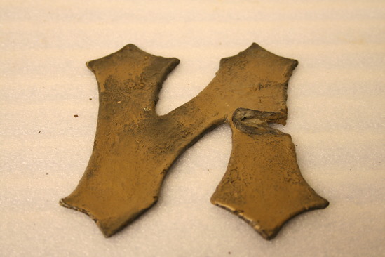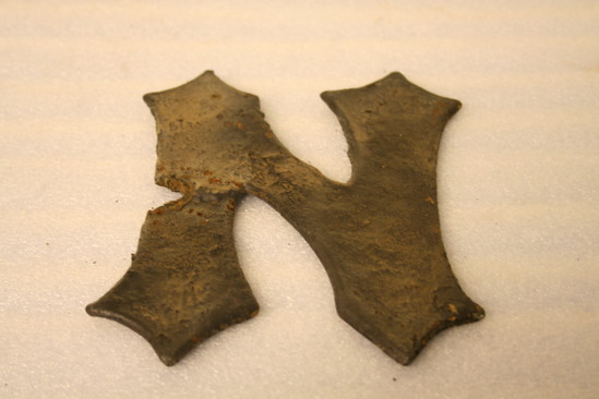 A: Weather vane - base is house shaped copper flashing box with iron shaft emerging to ball and shaft then cardinal points with diagonal braces, then a shaft and ball. The flag has stylized bird head with double XX box body and tail of arrows, one up and one down. Two horizontal at top and bottom with arrow on V base in center, then shaft, ball, shaft and ball with fleur de lis on top. B: "N" cooper, that had falled off main weather vane