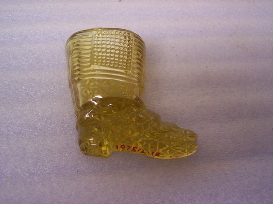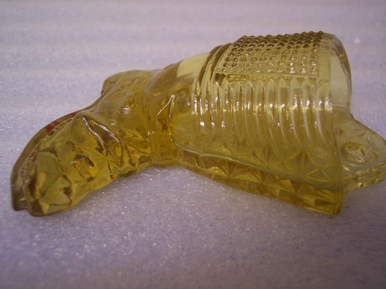 Boot shaped wall pocket for matches with nail hole. Yellow glass - fine cut back