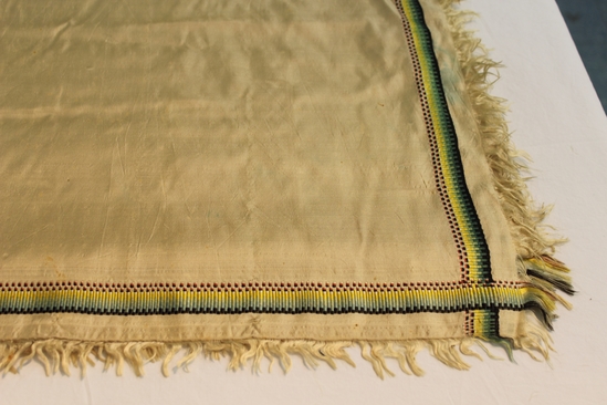 Beige silk shawl; short fringe on all sides; border of woven silk threads - black, green, yellow, and red - only 3/4"