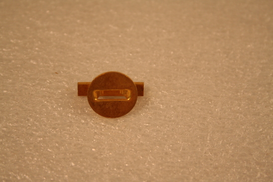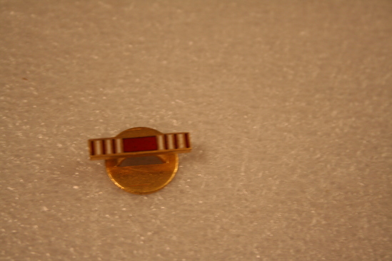 Small metal pin, gold base with red and white striped enamel pattern on face of pin. Issued as lapel pin with Army Good Conduct Award, likely during or immediately after WWII.