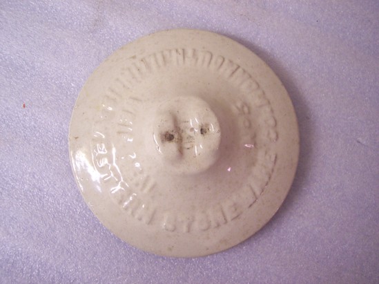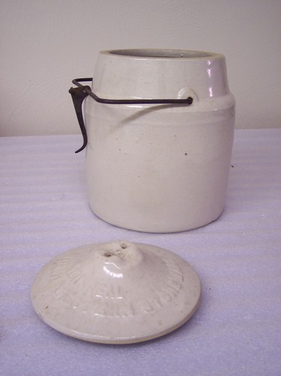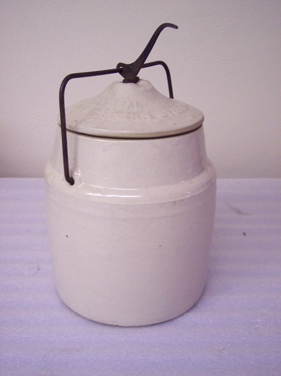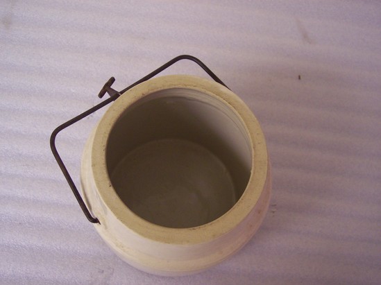 Off-white with clear glaze. Heavy wire bail handle. High shoulder with bail fitting into shoulder.Straight sides. Top rim unglazed. Underside of rim uniformly grooved and unglazed. Unglazed cover fits on rim. Opening 4" diameter.