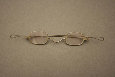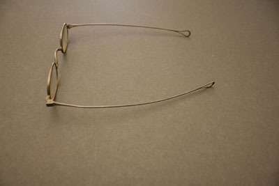 Squarish shaped lenses with clear glass. Bows are straight ending in tear drop loops at end. Pin replaced on right bow. "14" carved into right bow on outside.