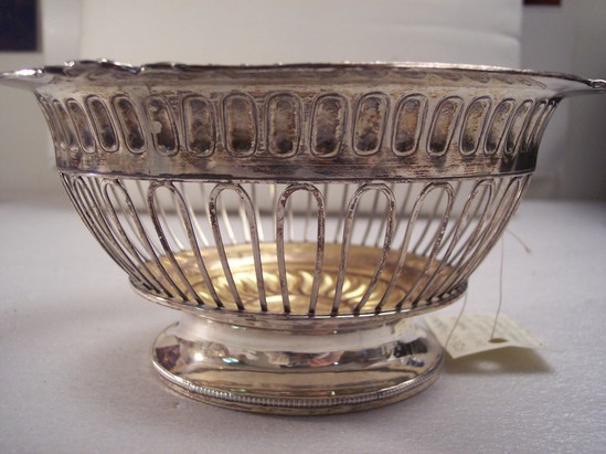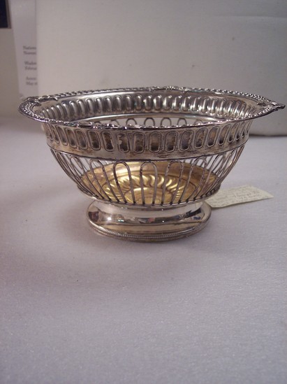 One of a pair of silver plated fruit baskets, circular baskets with open wire sides, rim with stamped leaf pattern border set off by four shells, sunburst pattern inside bottom which is gilt.