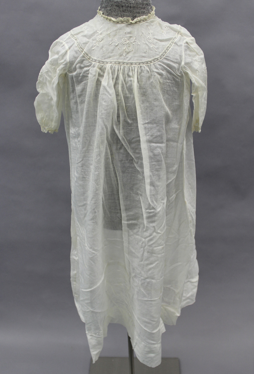 White sheer cotton child's dress; long sleeves with embroidery and lace; round yoke with embroidery and lace insertion; embroidery at hem; center back opening; no closures