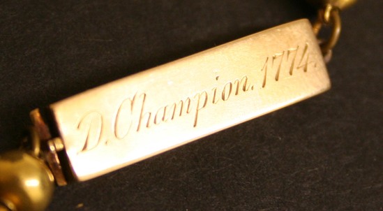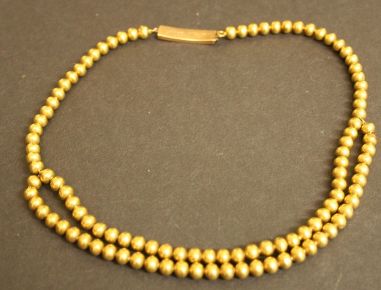Gold beaded necklace - partially double strand. Beads are strung on a braided linen strand. There is a rectangular gold clasp with a gold spring clasp. On one side is engraved "D. Champion. 1774" and on the reverse side "L.D. to E.H.P"