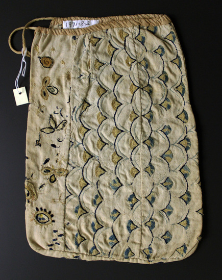 Woman's pocket. Front and back made of four pieces of linen embroidered with colored wool. There are two distinct patterns as if the pocket was made from two former articles. The pocket is made over into a bag with a drawstring. The opening was patched with another scrap of crewel work. Top bound.