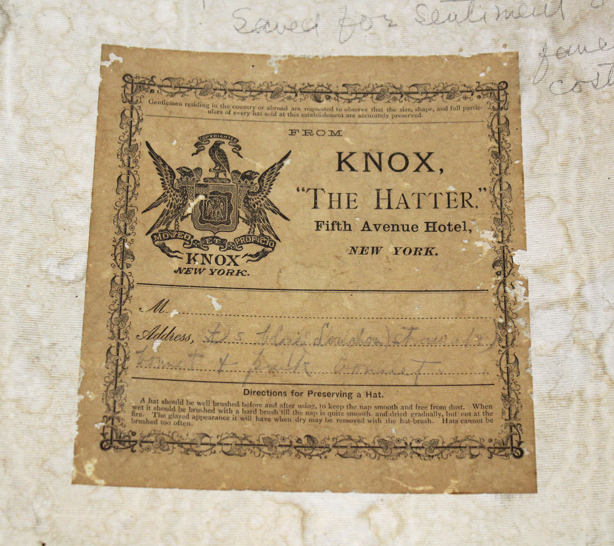 Woman's Hat Box, oval shape cardbard box covered with shiny white moire patterned paper, brown rectangular paper label pasted on top "From Knox/ The Hatter/ Fifth Avenue Hotel / New York /" blanks for name and address of owner" / "Directions for Preserving a Hat" Came with two hats, and a purse all belonging to Dorothy Deming, see "NOTES"