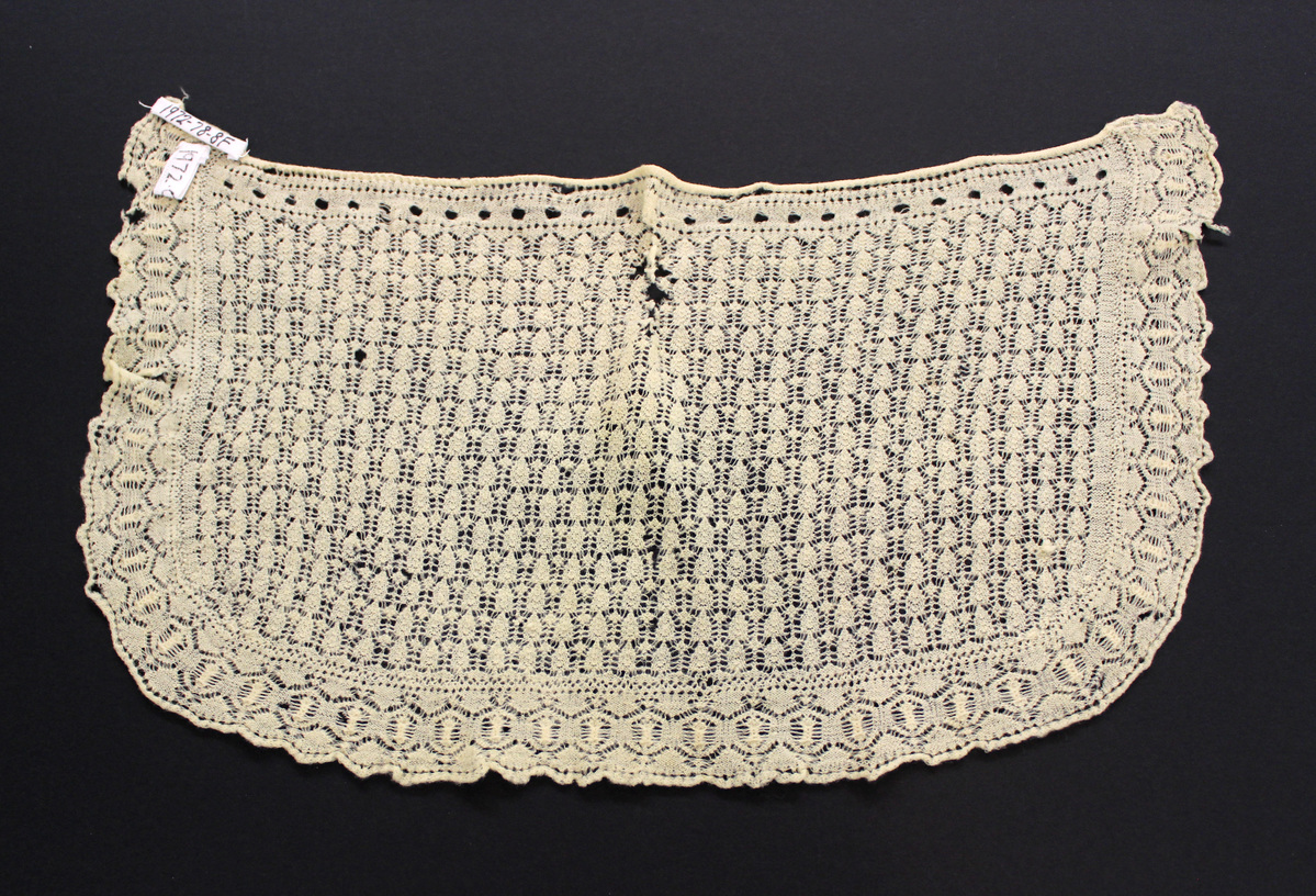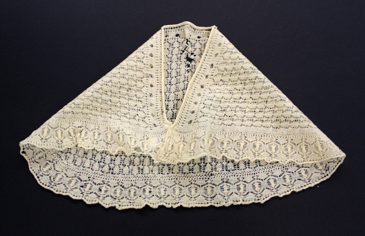 Cream-colored wool knitted child's shawl; rectangular shape with rounded corners; edge decoration on three sides rolled edge at neck; no closures