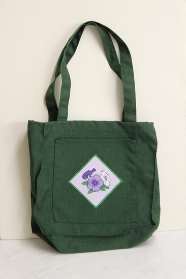 Green tote bag. Bag is square shaped with long double handles. Front has a patch pocket with applique. The applique is a purple and white striped fabric printed with purple and white petunias and green leaves. the bag is machine stitched. Inside of bag has a clear, polished coating.