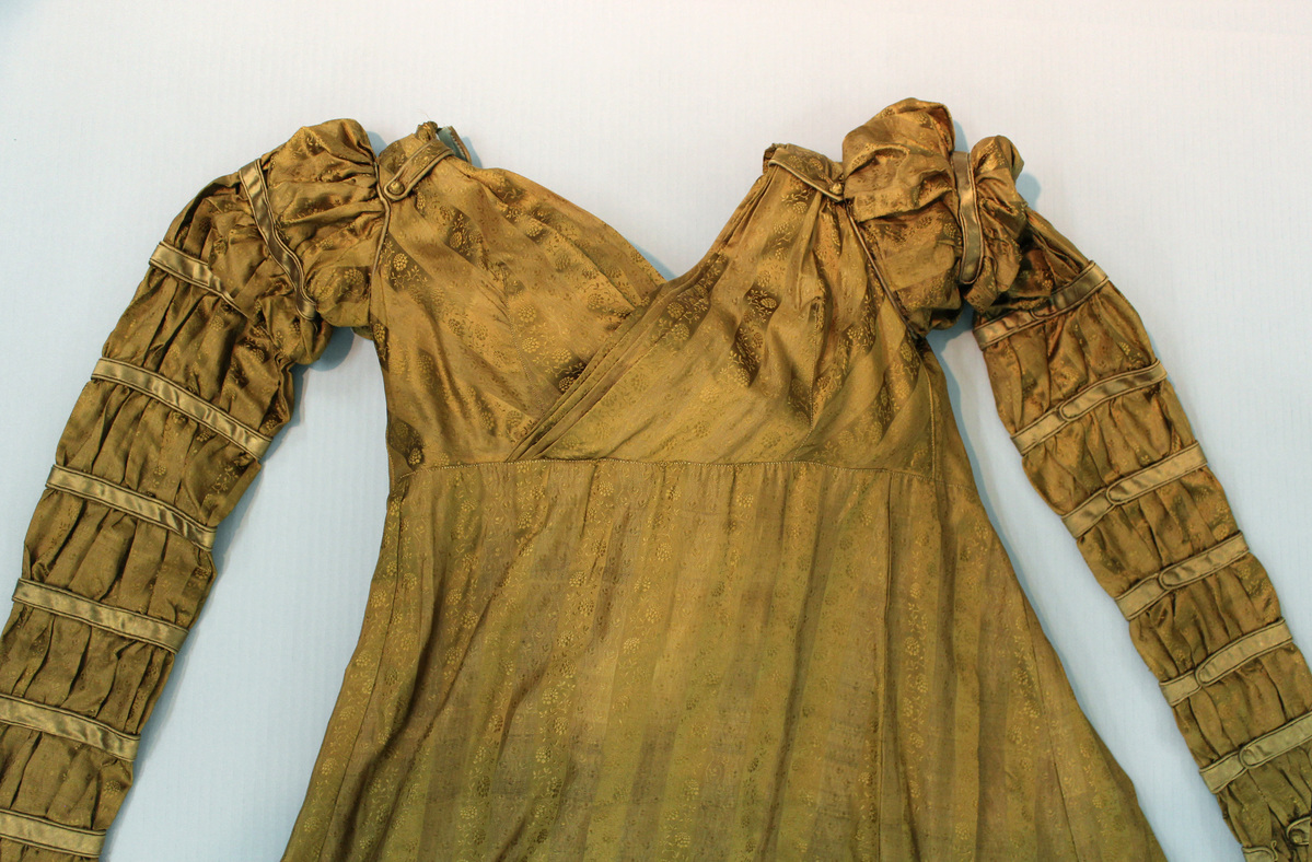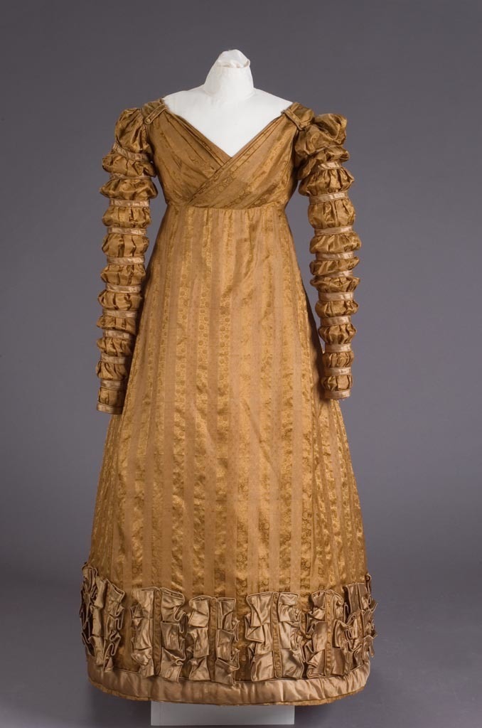 Dress of golden brown silk with vertical stripes of embroidered patterns, two types of floral design. V-line neck, long sleeves puffed at top, cinched with band at even intervals all the way down, and three-button closure at cuffs. Straight skirt bottom with decoration of gold silk ruffles in vertical lines. Band of gold along hemline.