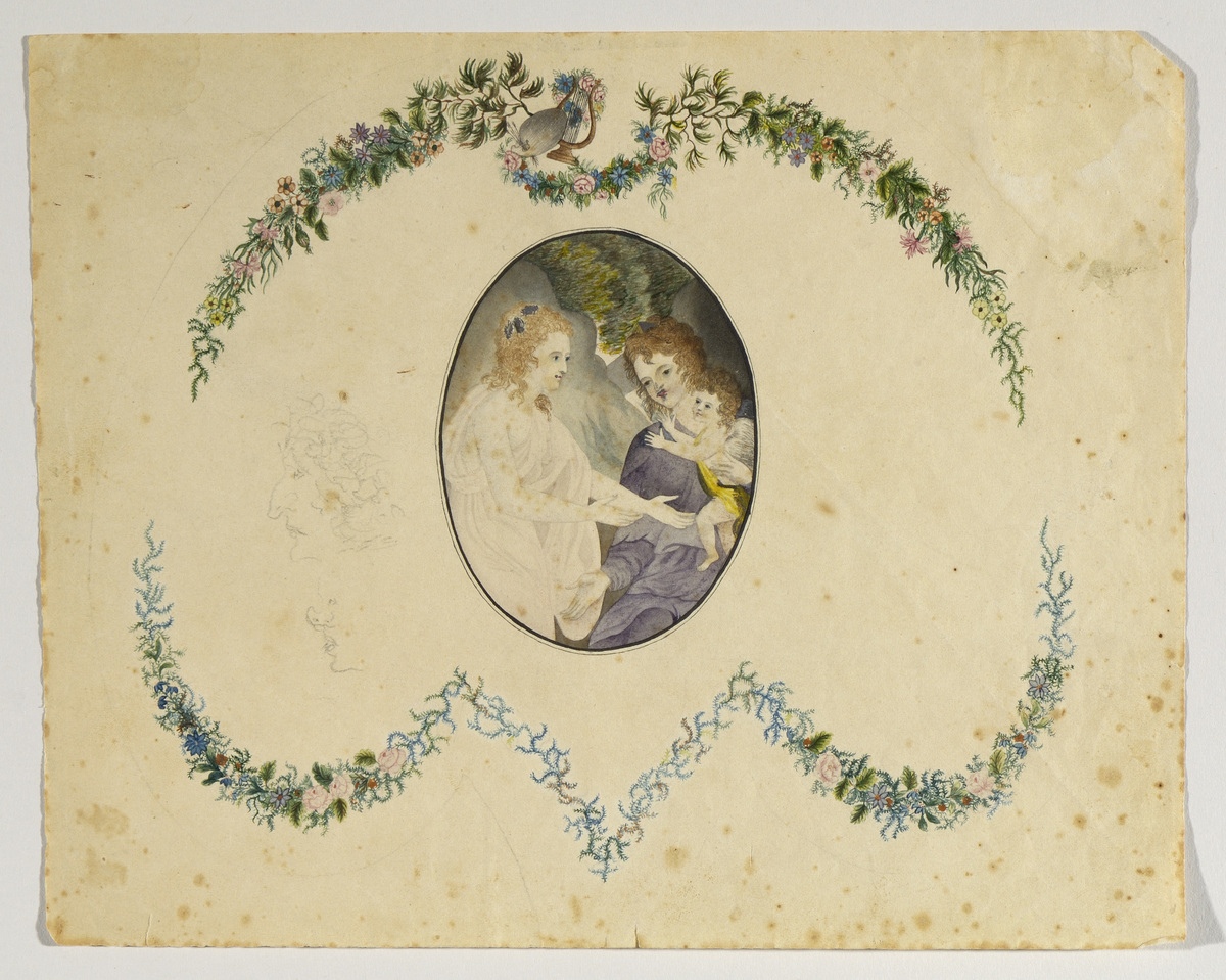 Uncut, watercolor on paper design for a hand-screen or fire screen. Central oval showing three figures, presumably a mother, father, and child. Figures are dressed in classical attire and set again background of gray and white clouds or mountains, with a sky of green at the top. Above the oval is a swag of intricate floral shapes, largely in greens, with a lyre and painter's palette at the center; below the oval is a second swag of floral designs, largely in blues, and forming a chevron shape at the center. To left of central oval, two unfinished pencil sketches of faces, in profile; likely a later addition. Faint pencil line around outside of design, likely indicating where it was to be cut.