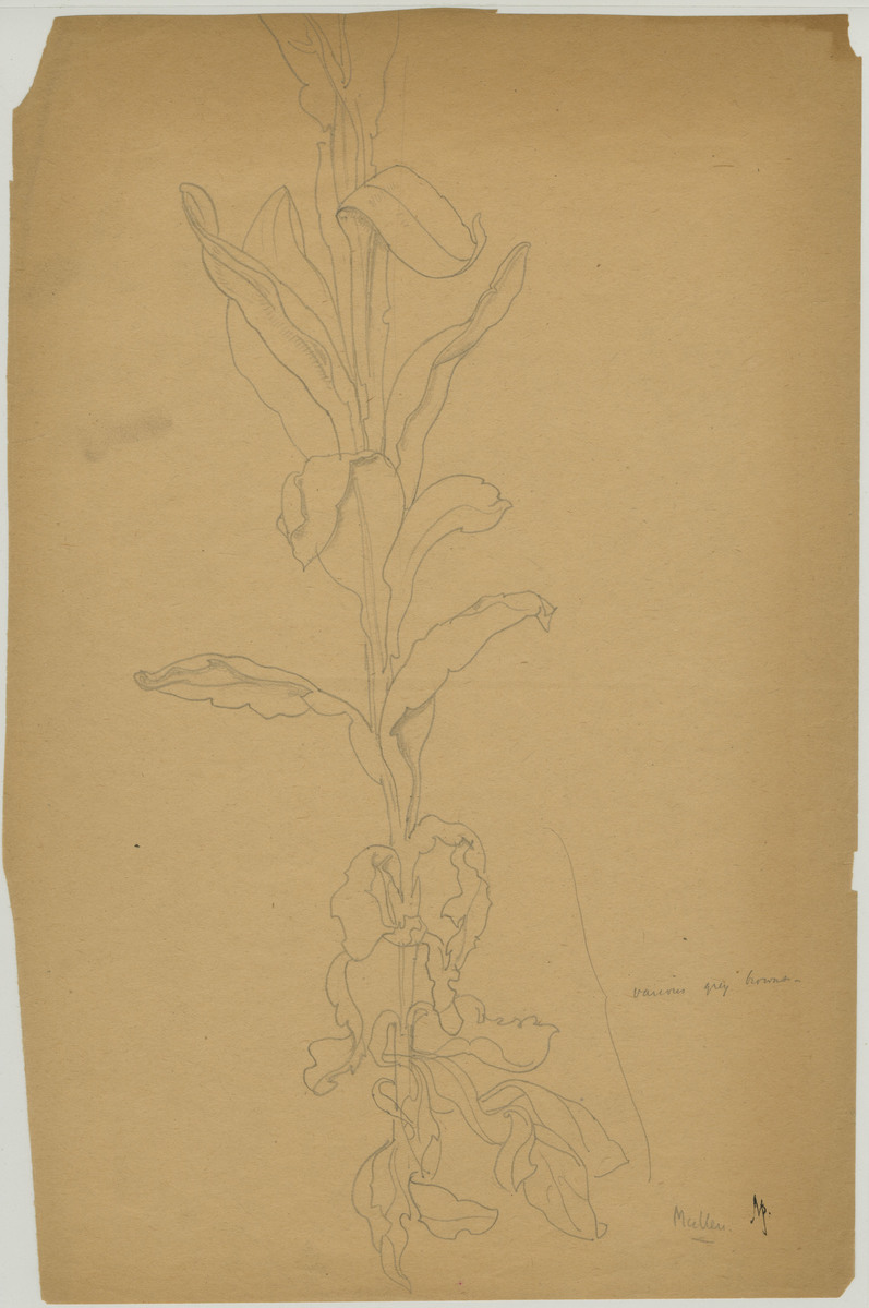 Pencil sketch on paper of Mullein Plant. Lower half of the plant in the sketch appears to be wilting and is labeled in pencil "Various grey browns." by the artist. initialed in black pen on the bottom right hand corner. No date.