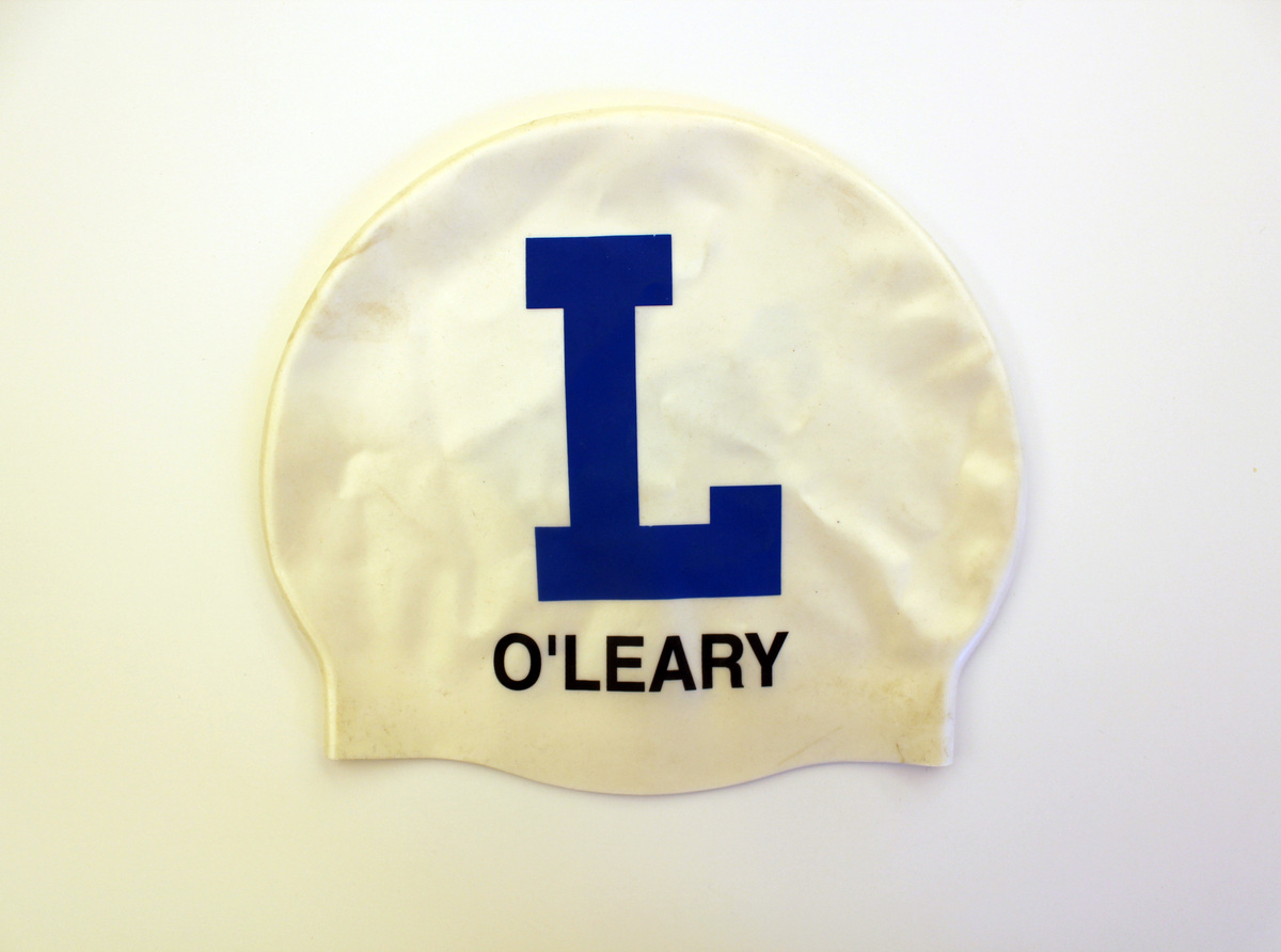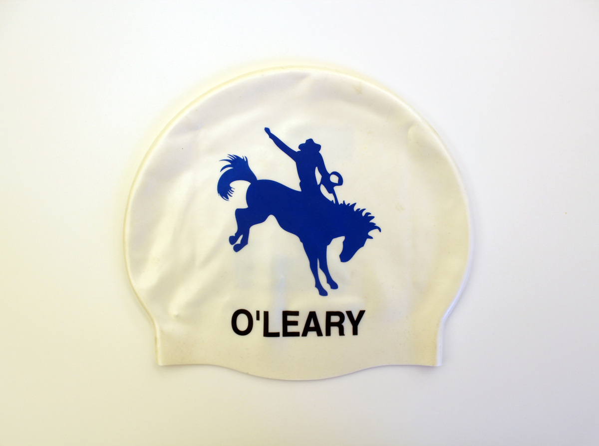Swim cap, white silicone with printed blue and black design. On one side, large blue "L" with black text below, "O'LEARY." One reverse side, blue cowboy on horse (outline) with black text below, "O"LEARY."
