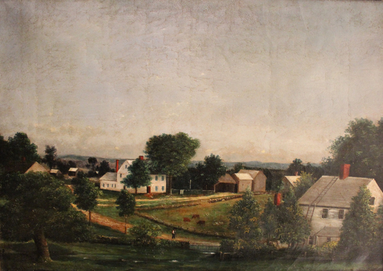 Oil on canvas painting of Smith's Tavern, Morris, Connecticut. Painting shows landscape of South Farms, originally settled in the 1720s as part of Litchfield, and later incorporated in 1859 as the separate town of Morris. Visible are the c.1764 Elihu Harrison house (center) on Straits Turnpike and the c. 1746 Gideon Harrison house (right) on present-day Route 109. Also shown are various outbuildings, animals, and one figure (foreground, on path). Inscribed on reverse, "Original Study of Capt. Simeon Smith Place in Morris, CT by NA Moore in 1855"