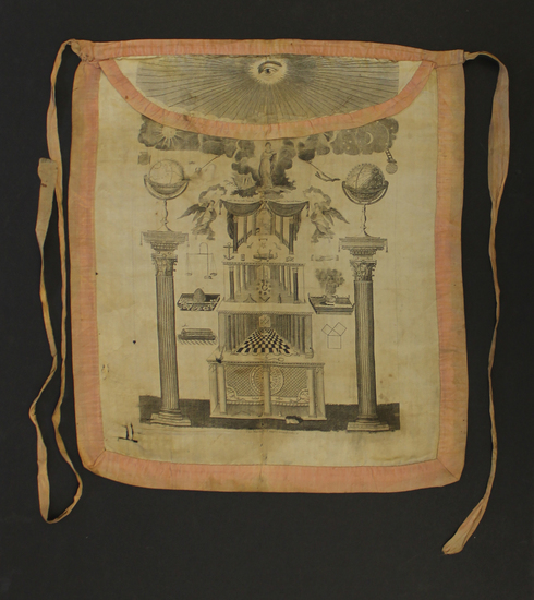 White silk Masonic apron with pink silk ribbon trim and ties. All seeing eye printed on flap. Masonic symbols protection in black on body of apron. "The Master Carpet Compleat" painted below decoration.