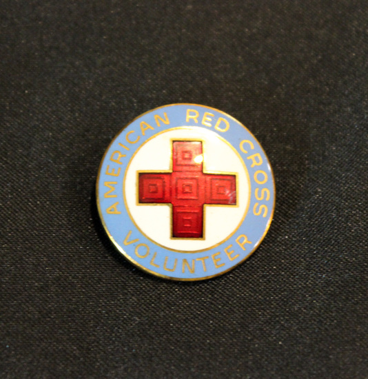 Round pin. Blue border around white field. Red cross in center. "AMERICAN RED CROSS VOLUNTEER" in gold with blue border.