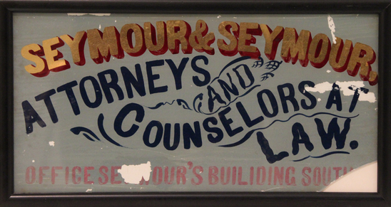 Sign made of reverse painted glass in black frame. Background of sign painted light blue. Lettering done in gold, red, dark blue, and pink. Sign reads "SEYMOUR & SEYMOUR,/ ATTORNEYS AND/ COUNSELORS AT/ LAW./ OFFICE SEYMOUR'S BUILDING SOUTH"