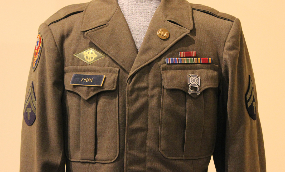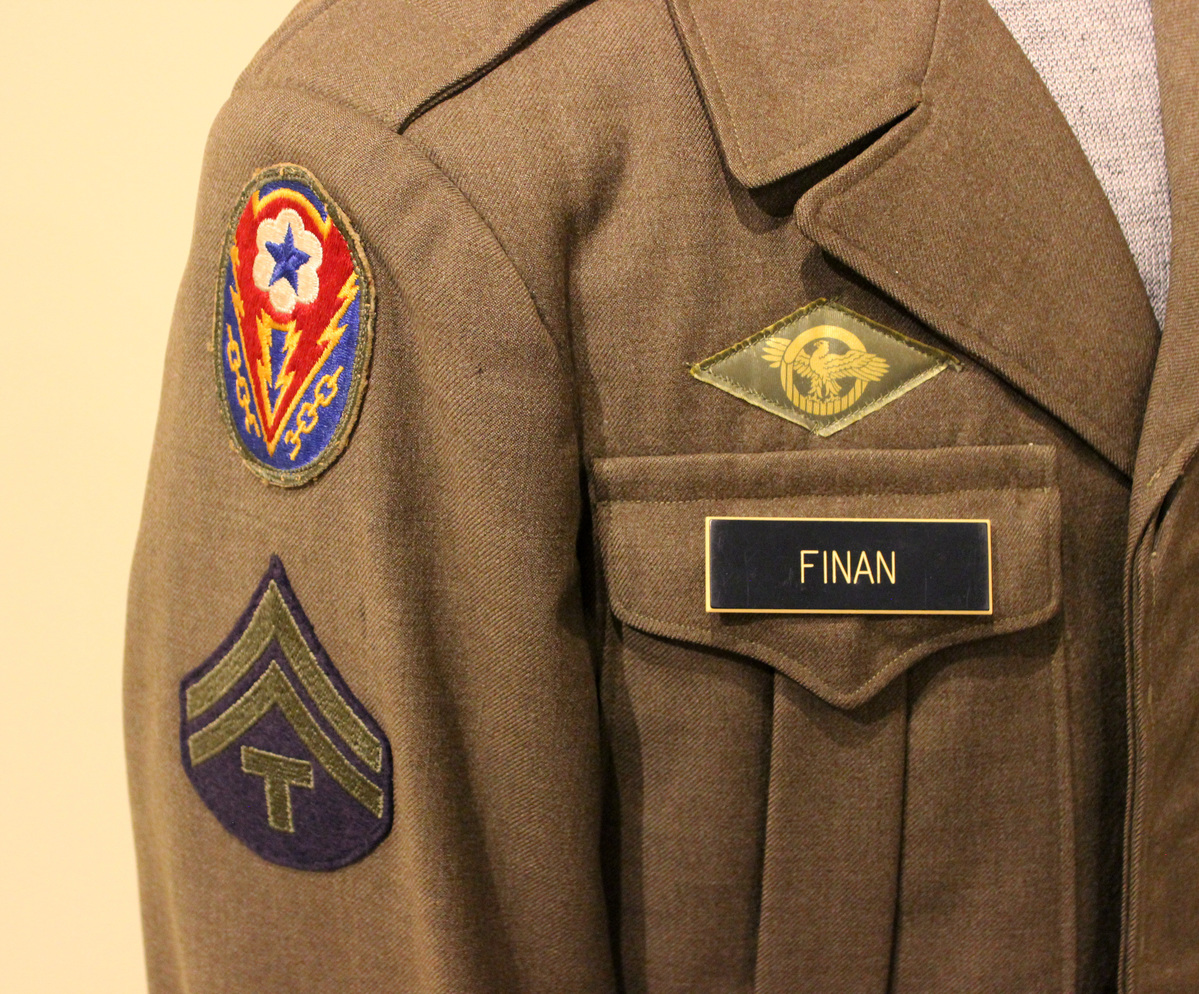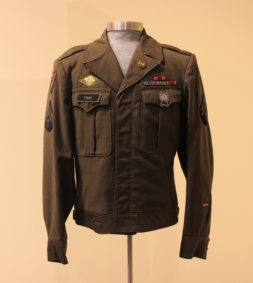 U.S. Army uniform jacket, World War II era. Olive wool Eisenhower or "Ike" jacket. Notched lapels, placket front with buttons. Two flap breast pockets. Chest pockets on both sides. Long sleeves with buttons cuffs. Epaulets with buttons on shoulders. Metal buckles at side waist. Fabric tag at right center-back with text, "36R." Loop at center-back. Lined with tan cotton. Chest pockets on both sides. On right breast pocket flap, nametag with text "FINAN."