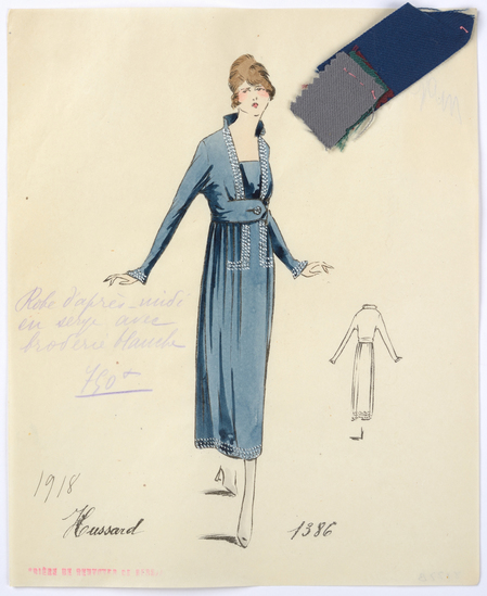 Lithograph and watercolor on paper fashion design. Afternoon dress in serge with white embroidery. Fabric samples accompany rendering.