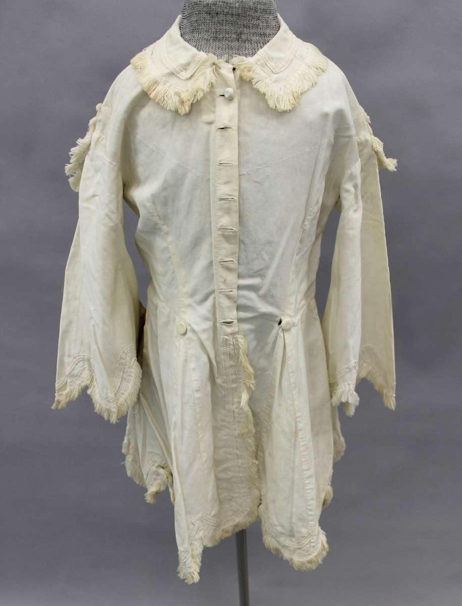 White cotton child's coat; long bell/pagoda sleeves with scalloped edge with braid and fringe; round pointed collar with braid and fringe; fitted top with gored skirt; back with scalloped collar piece with braid, fringe and buttons; covered buttons at waist; center front opening with covered buttons closure and hooks and eye at neck